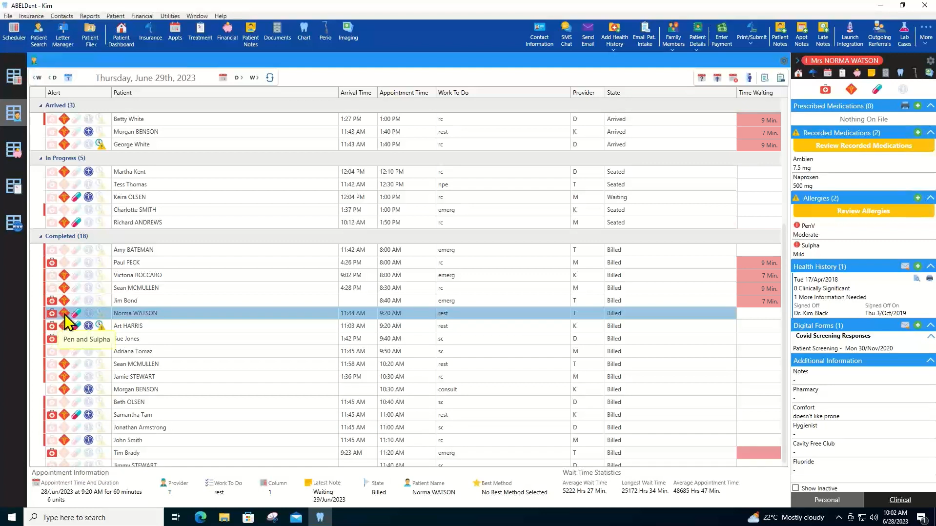The Patient Manager allows you to plan for and manage progress over the course of your day. The Patient Manager organizes patients by appointment status, including confirmation status, and indicates which patients have arrived in the practice and how long they have been waiting. For each patient, the Patient Manager displays important alerts and notes like medical concerns, medication, special needs and any history of lateness or missed appointments. The Patient Manager is an excellent tool for your morning huddle or for each provider to manage their progress over a day.